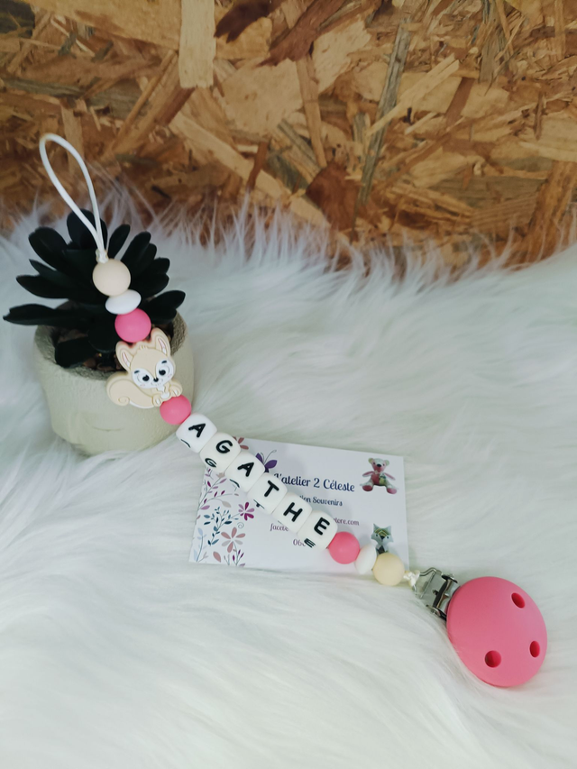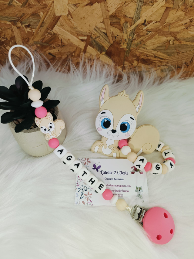 Je vous propose une attache tétine en silicone décoré d'un écureuil beige personnalisable avec le prénom de votre choix