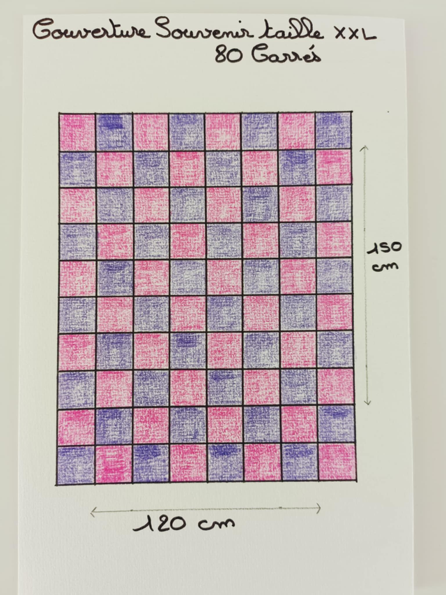Taille XXL 120x150 cm, elle est composée de 80 carrés de 15/15 cm