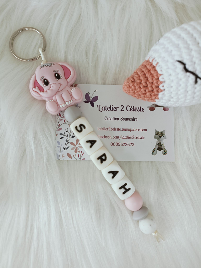 Porte-Clés en silicone décorée d'un éléphant personnalisable avec le prénom ou mot de votre choix jusqu'à 10 lettres