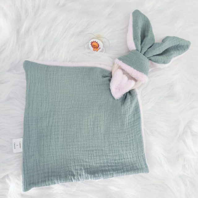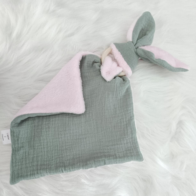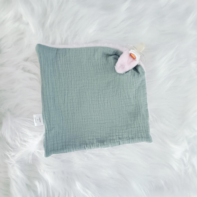Confectionné à la main avec de la double gaze verte menthe et doublé de polaire rose pour encore plus de douceur et de réconfort.